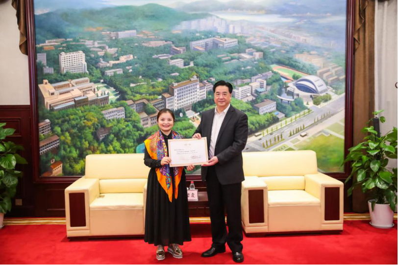 李元元校长向吴碧霞教授颁发华中科技大学兼职教授、美育名师聘书。