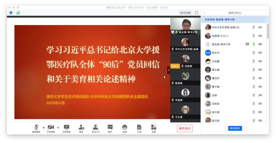 4月23日下午,华中科技大学高水平艺术团戏剧团与清华大学学生艺术团话剧队成功举办联合主题团日活动,两校共70余名师生同聚云端,以“疫情同风雨”“艺术共追求”“青年勇担当”三个篇章搭建起两团队的友谊之桥。
