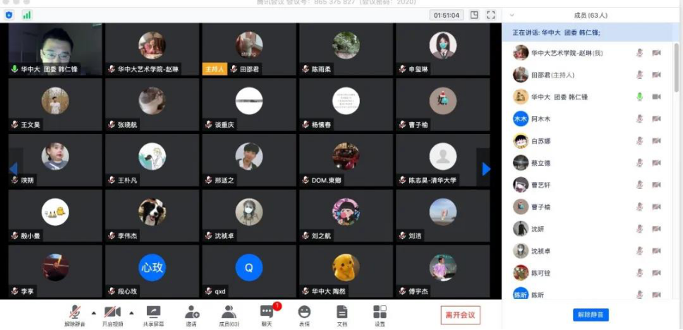 在自由讨论环节中,清华话剧队刑适之、华中大戏剧团常城等同学分享了他们在疫情期间的所见所闻、所行所感,常城作为志愿者转运抗疫物资的经历让两校师生深受感动。