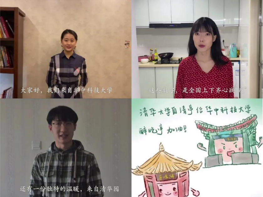 两校互助,风雨同担。4月26日是武汉解封的第19天,是武汉整体降为疫情低风险地区的第9天,这是全国上下齐心战“疫”、共同努力取得的成果。“江城已经春暖花开,感谢你的坚守,感谢你的相助。”华中科技大学高水平艺术团戏剧团同学用歌声传递爱与温暖,感谢全国各地对疫情中心武汉的驰援。“从清华园到喻家山,牵挂从未停止,我们坚信,明天会更好!”清华大学话剧队同学也表达了他们的真挚心声,”想和你们一起,继续为更加美好的明天而奋斗!“