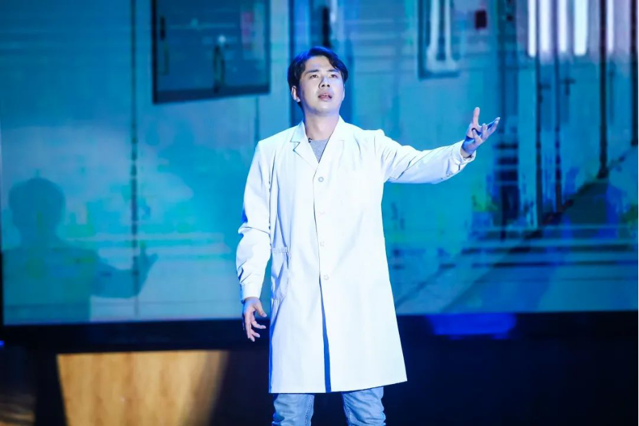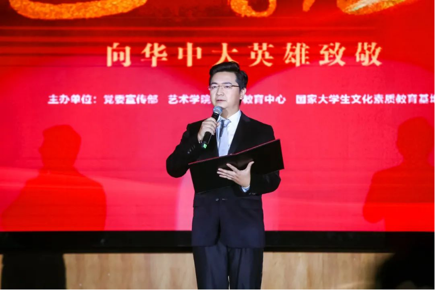 演出正式开始前,华中科技大学新闻与信息传播学院副教授龚超老师向全体观众介绍此次晚会的筹备情况和举办意义。在这台晚会中,艺术学院师生用包含音乐、舞蹈、戏剧在内的舞台艺术形式,以真实的人物故事和真挚的情感表达,向华中大英雄致敬。