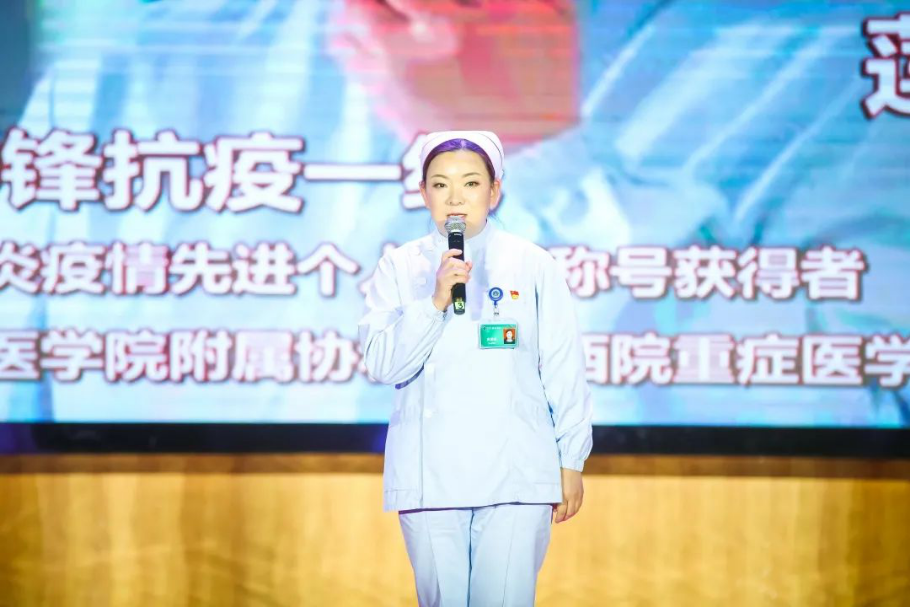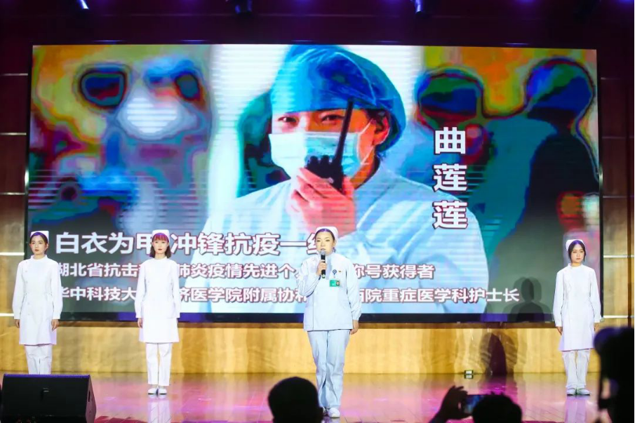 本场晚会特别邀请到湖北省抗击新冠肺炎疫情先进个人荣誉称号获得者、华中科技大学同济医学院附属协和医院西院重症医学科护士长曲莲莲,她与新闻学院播音主持专业三名学生共同表演朗诵《最美逆行者》。